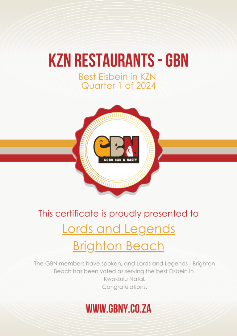 QUARTER 1 Winning the BEST OF EISBEIN AWARD as voted for by the members of GBN for the first Quarter of 2024, with 31% of the total votes received… lords and legends - brighton beachTel: 074 208 7867 You can find Lords and Legends – Brighton Beach at: Other nominees, in no particular order, include:  Siggis German Restaurant – Salt RockThe Lookout – Glen AshleyKloof Country ClubSummerveld LodgeThe Bierfassl Restaurant & PubConnor’s Public HouseStoker’s Arms – KloofWaxy O’Connors – SunningdaleRoyal Natal Yacht Club