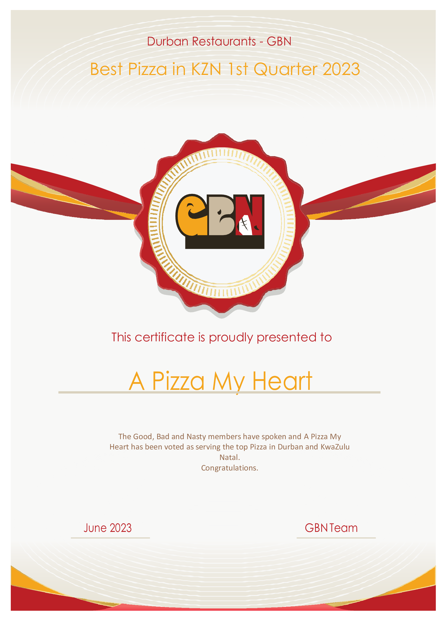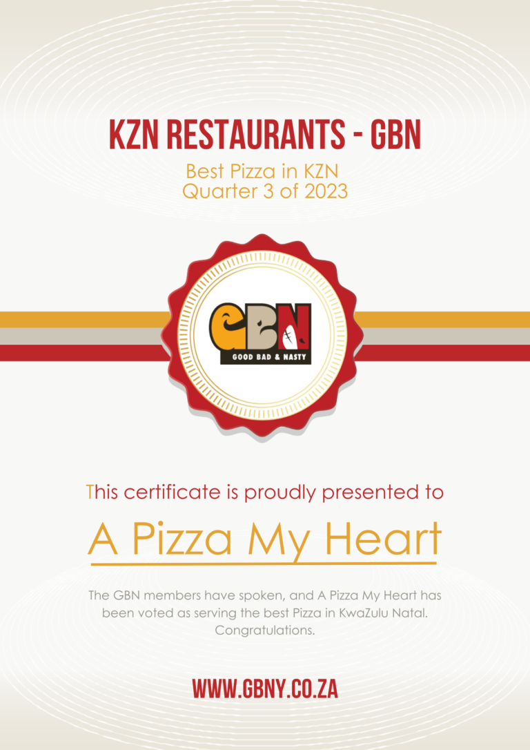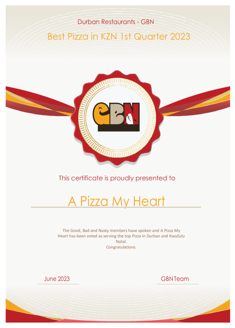 Winning the “Best of” Pizza Award as voted for by the members of GBN for the first Quarter of 2023, with 32% of the total votes received…
