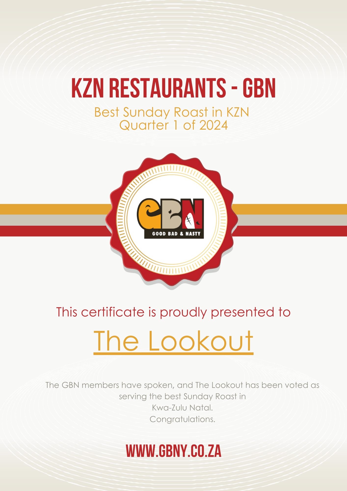 QUARTER 1 Winning the BEST OF SUNDAY ROAST AWARD as voted for by the members of GBN for the first Quarter of 2024, with 47% of the total votes received… The lookouttel: 065 906 4661 You can find The Lookout at: Other nominees, in no particular order, include:  Little HavanaKayla-Ann’sUrban 68Connor’s Public HouseLords and Legends – AmanzimtotiStella Soccer Club